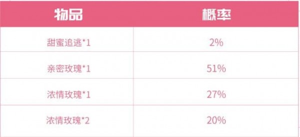 购买礼包,必须红蓝对决(1日),可随机获得以下之一:甜蜜追求*1、贴心玫瑰*1、深情玫瑰*1、深情玫瑰*2。累计20次至少获得甜蜜追求*1。