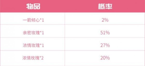 购买礼包,获得红蓝对决(1日),可随机获得以下之一:一箭坠入爱河*1、知心玫瑰*1、深情玫瑰*1、深情玫瑰*2。累计20次,至少得到一个箭头*1。