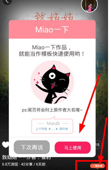如下图,当界面出现评论、分享等按钮时,右下角的喵按钮就是可以使用模板的按钮。点击后会出现如下图所示的提示框,点击即可立即使用。