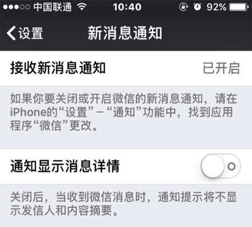 为了保护消息的隐私,很多微信的用户都会将通知显示详情设置为关闭【设置-新消息通知-通知显示详情(关闭)】。这样,当我们收到一条微信消息时,通知提示就不会显示发件人和内容摘要。在之前版本的iOS系统中,锁屏界面下的微信消息提示只显示“您收到了一条微信消息”这句话。现在很多用户发现iOS 10系统下的锁屏微信消息增加了人名(发件人姓名)。因此,一些有严重隐私的患者觉得这种显示也是暴露消息隐私的一部分。但是目前没有取消显示姓名的设置方法,只能等待微信的更新或者系统的更新。