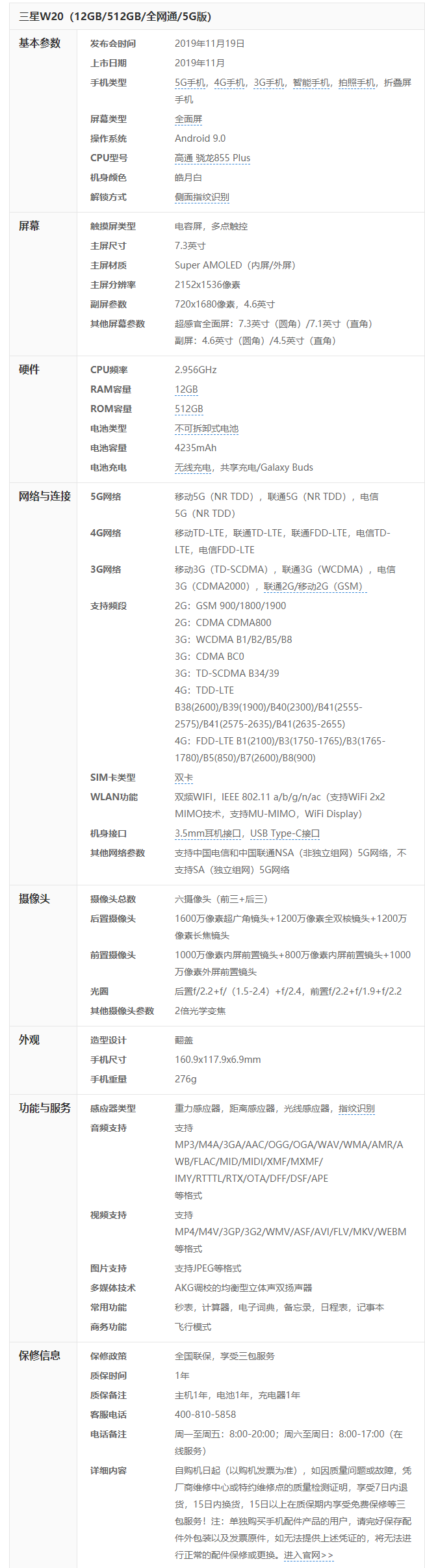 二、三星w2020详细参数:(点击下图查看大图)