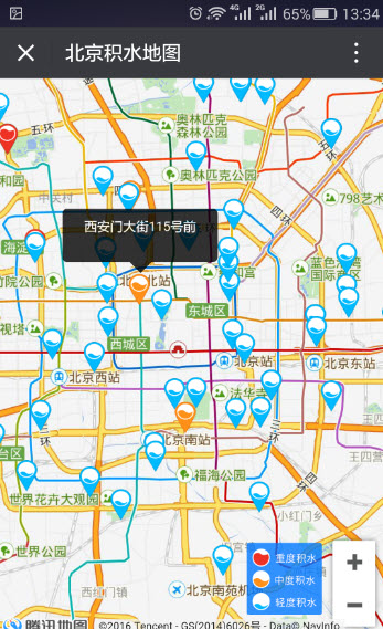 点击积水点,显示具体积水位置,颜色代表积水程度。