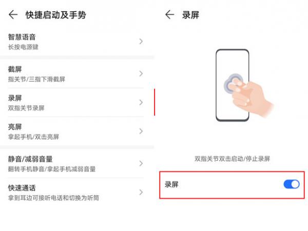 -点击屏幕录制选项,打开屏幕录制右侧的开关,双击屏幕上的指关节进行屏幕录制。