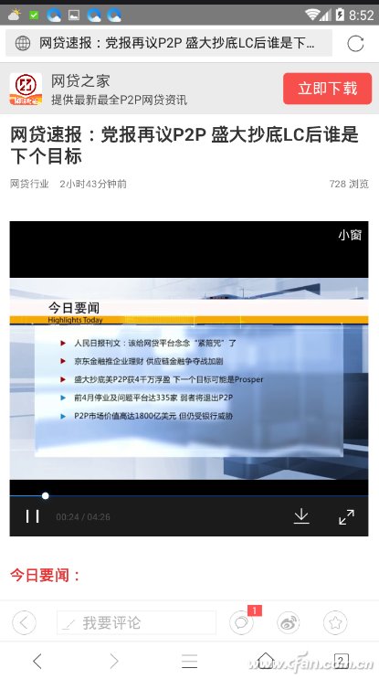 此外,微信中还有一种嵌入网页的视频资源。对于这类资源,在微信中打开网页后,如上选择“在浏览器中打开”,用QQ浏览器打开后点击视频播放页面。播放页面上会出现一个下载图标,点击后就可以开始缓存页面上的视频了。
