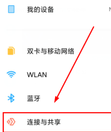 2、然后在设置中找到【连接和共享】进入。