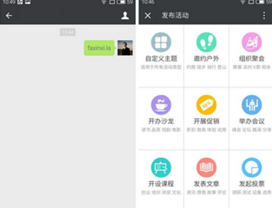 我们可以在任何聊天对话框中输入代码“faxinxi.la”。发送完代码后,点击刚发送的代码,进入信息发布界面。进入信息发布界面后,我们可以在这里设置活动计划。设置好之后,分享给朋友或者个人都是不错的。