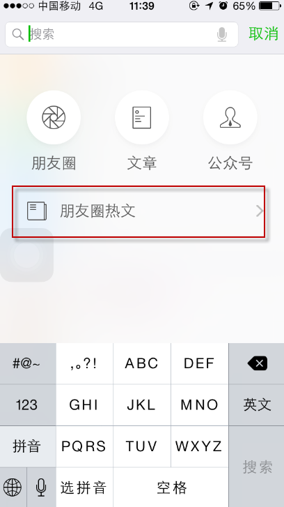 2.在搜索栏,可以看到朋友圈热门文章的选项。