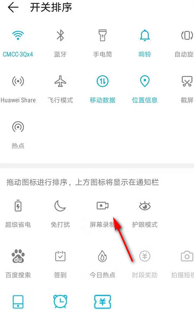 2. 进入开关排序页面,点击录屏。