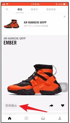 2、下载完成后,打开snkrs找到带有“即将推出”标签的鞋子,查看其发售时间。