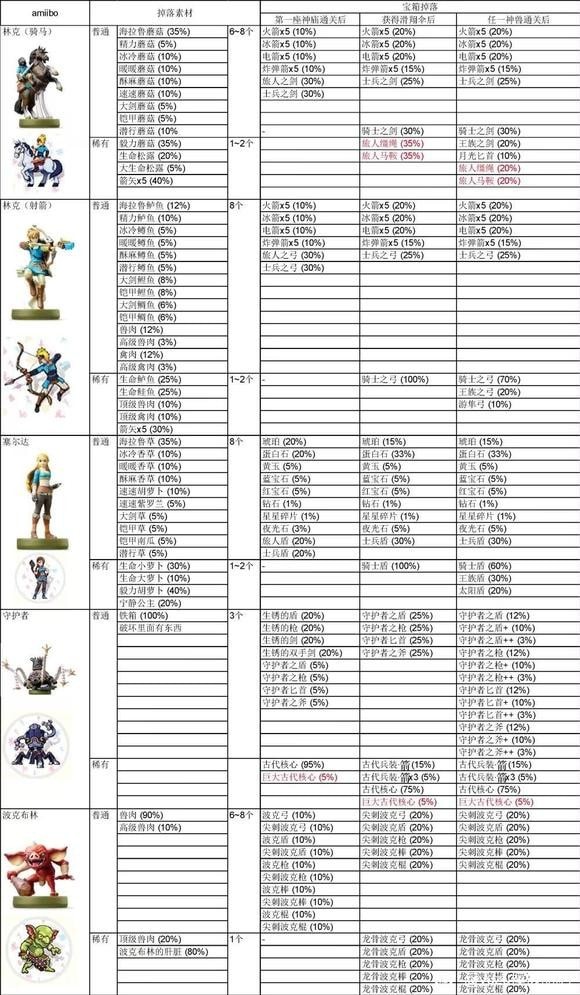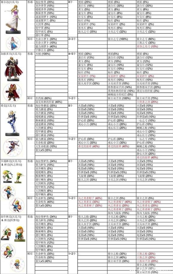 想必大家都不知道塞尔达传说王国之泪amiibo掉落表有什么,那就来看看《王国之泪》的万能amiibo数据对比表吧!