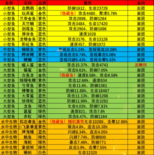 种类 名称 品质 最低钓具 鱼饵 小型鱼 花瞅 绿色 速度552、防御1127 面团 小型鱼 射水鱼 蓝色 攻击3878 面团 小型鱼 盲鱼 紫色 攻击3n9、生命14100 面团 小型鱼 毒沼鱼 金色 速度650、泥泞3.6% 面团 中型鱼 鳜鱼 绿色 忽视连击8.3、忽视击晕3.2 面团 中型鱼 七鳃鳗 蓝色 忽视暴击9.0%、忽视反击4.3% 面团 中型鱼 恐龙鱼 蓝色 忽视吸血9.0%、忽视连击4.3% 面团 中型鱼 犁头鳐 紫色 忽视闪避10.7%、忽视反击4.0% 面团 中型鱼 帝王三间鱼 金色 忽视击晕6.8% 忽视暴击5.8%、忽视连击5.83 甲虫饵 大型鱼 鸭嘴鱼 紫色 生命13.0%、速度560 面团 大型鱼 六须鲶鱼 金色 生命14.0%、生命18223 面团 水中生物 水蛭 白色 吸血6.2%、闪避&5X 面团 水中生物 大鲵鱼 蓝色 击晕10.6%、 反击2.64 面团 水中生物 红眼蟾除 紫色 暴击12.8%、 速度600 面团 水中生物 水獭 金色 连击13.8%、攻击1871 水黾饵枫叶海滩绿线1蓝色漂移1