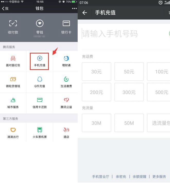 1进入微信点击【我】>【钱包】>【手机充值】,然后点击右下角的【更多服务】。