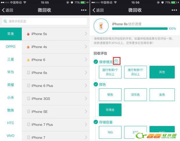 评测过程很简单,根据你手机的情况,点击型号、版本(标在手机背面)、保修、颜色、容量等信息即可。有些选项后跟“?”签,可以点击查看说明。
