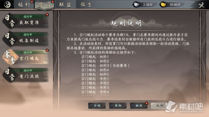 以宗门崛起为例。每个季节持续七天。通过提升弟子实力,提升门派整体战斗力。赛季结束后,排名越高,奖励越高。但是每个参与的负责人可以根据排名获得奖励。