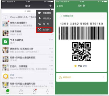 2步操作就是点击微信聊天界面和右上角的+号,进入支付码界面。这是大多数人的操作路径。