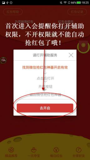 2.第一次打开我们的【微信抢红包神器】,会提醒你打开辅助权限,让你抢红包的速度大增!具体如下图所示。