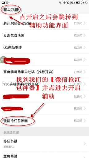3.点击【打开】后,会跳转到红包辅助功能界面,找到我们的【微信抢红包神器】,打开辅助功能。