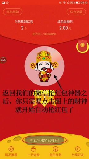 4.开启【微信抢红包神器】辅助功能后,此时可以返回我们的软件首页。如果你想自动抢红包,只需在首页点击财神,服务就会启动。