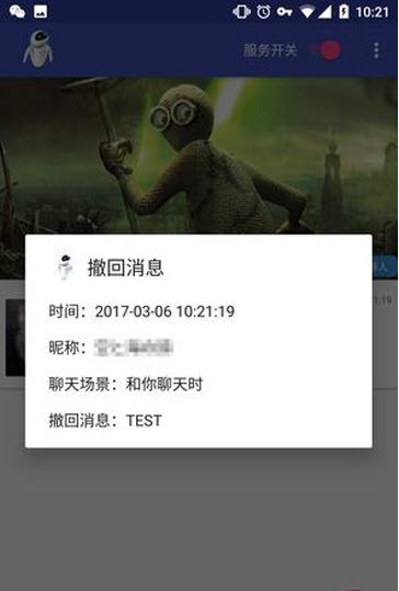 根据App中的介绍,这款机器人EVA可以防止微信消息的撤回,其原理是读取微信的消息日志。一旦发现撤单消息,会自动呈现此人两分钟的所有消息。看起来还挺靠谱的,那么实际效果如何呢?