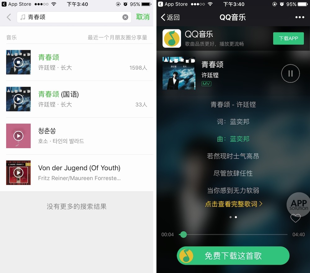 音乐的结果来自QQ音乐,按照分享到朋友圈的量排序。点击结果页面上的封面开始播放。