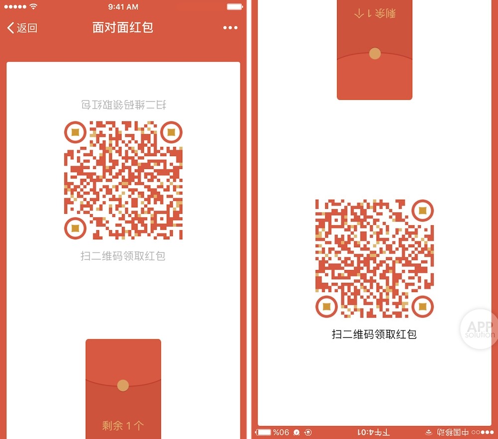 我们可以看到,二维码的上方和下方都有提醒字样。当收到红包的手机向对方倾斜时,对方看到的字体颜色会加深,顶栏会收起来。可见微信在这个功能上花了不少功夫。