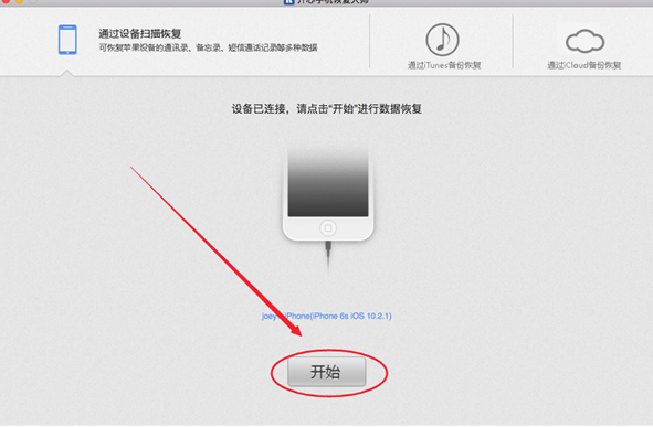 第二步:然后运行快乐手机恢复大师,然后用数据线将手机连接到电脑上。如果是第一次连接,我们需要在手机上点击按钮信任这台pc。当手机连接成功后,我们可以直接点击下方的“开始”按钮,然后就可以进入下一个恢复界面了。