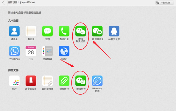 第三步:此时我们可以在第一种模式下进入数据恢复模式。我们可以看到有很多数据项图标:微信聊天记录、通讯录、备忘录、照片等。现在我们只需要找到“微信聊天记录”的图标,点击即可。