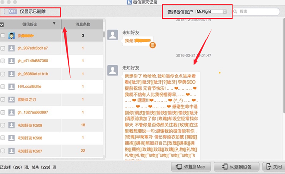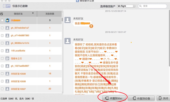 第五步:最后在左边的方框中勾选你想要恢复的微信聊天记录,然后点击右下角的“恢复到Mac”按钮,将这些记录恢复到电脑中保存。