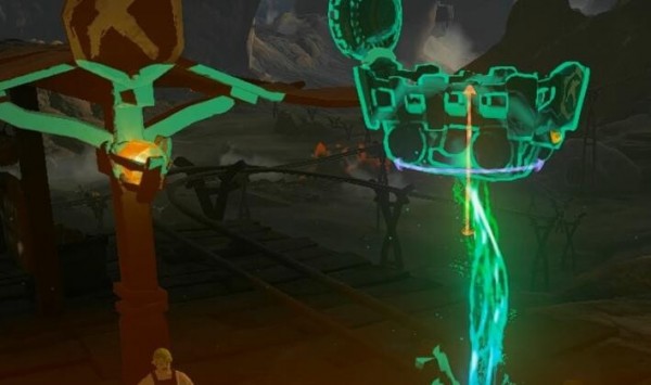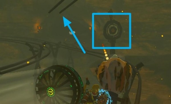 1、来到地图所示的位置,然后把矿车放在正确的轨道上,带着矿车前进。