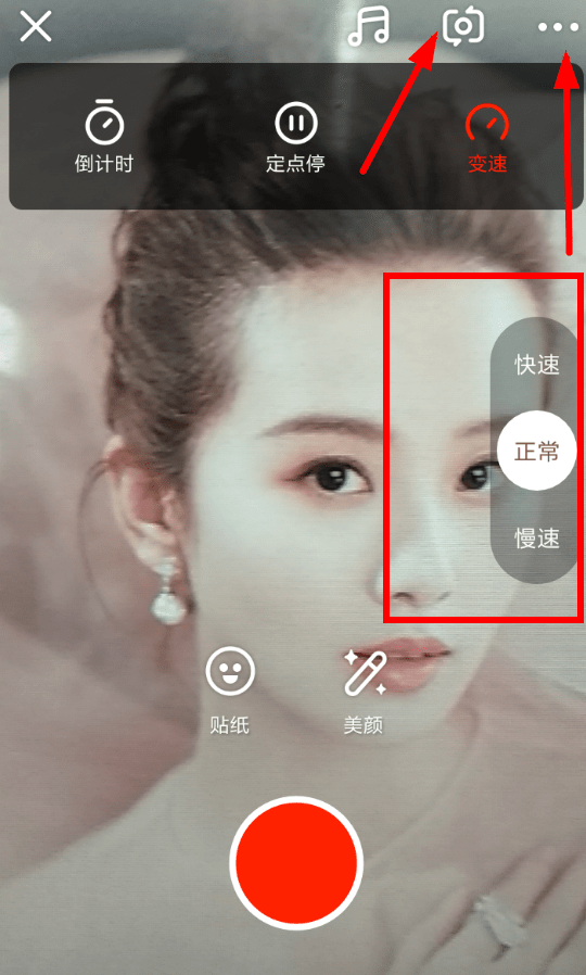 此外,用户通过右上角的“.”按钮调出菜单列表后,可以使用“变速”功能设置慢镜头和快镜头的效果,让拍摄变得更有趣。