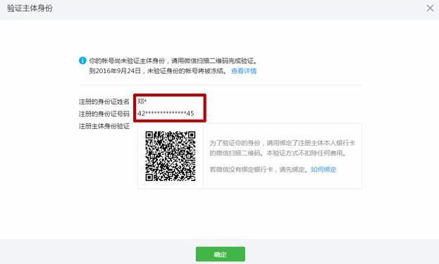 请登录公众平台,勾选首页弹出框提示身份验证,点击验证查看:身份证姓名、身份证号、二维码,用本人银行卡绑定的个人微信号扫码。扫码后,在手机上确认。公共平台提示验证通过,点击确定。