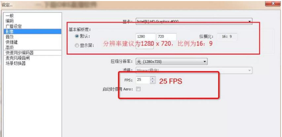 3、视频:基本分辨率可以写在你的屏幕分辨率中,默认不设置压缩分辨率。 FPS 帧数建议为25。如果您感觉卡住了,可以选中禁用Aero。