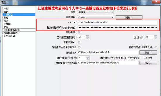 2、直播设置:个人中心直播设置—— 获取直播码—— 获取服务器及码流