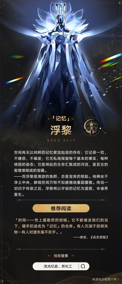 掌管“记忆”命运的星神,记录所有被遗忘的事物,准备在宇宙中重生。可能和三七有关吧,毕竟三七的灵魂都在[记忆里...].