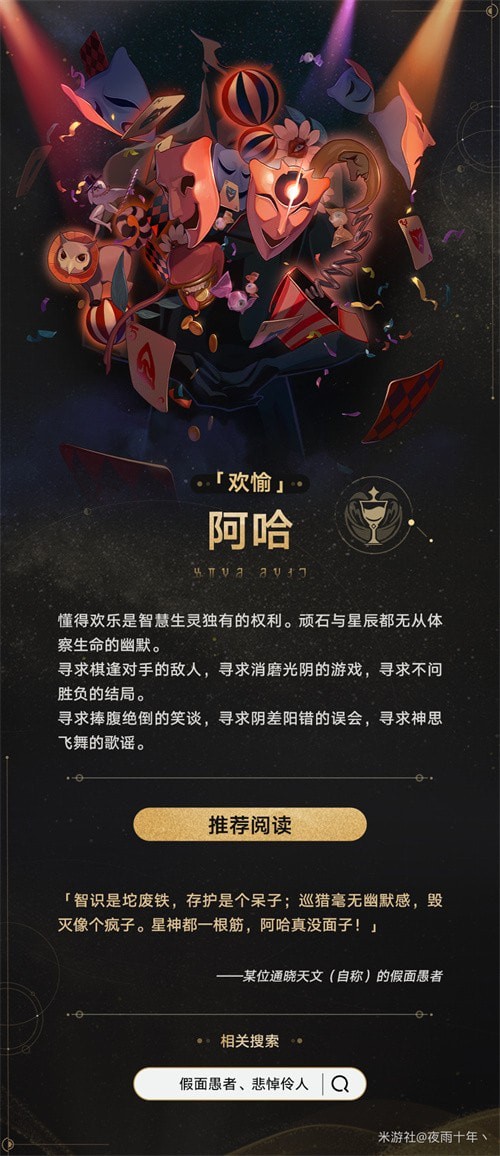 知道幸福是智慧生物独有的权利。石头和星星都无法观察生活的幽默。求棋逢对手,求游戏消磨时间,求胜负不问胜负。求一个爆笑的笑话,求一个误打误撞的误会,求一首满含思念的歌。我曾经爬上想象中的树的枝头,去了解宇宙的真相,然后我就萎靡不振,直到听到婴儿的啼哭和笑声,于是我升级为“快乐星神”啊哈。可以说“开心”阿哈其实是世界上真正对生命友好,尊重所有好玩的人的星神之一。