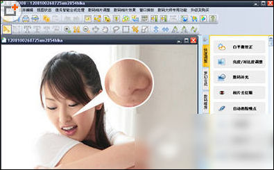 第二步:点击软件右栏“数字暗室”选项卡,然后找到“去斑”按钮并点击,如图2所示,弹出“去斑”操作对话框。