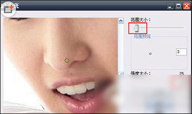 “去除散斑”对话框的操作方法:首先根据下图中红色方块区域框出的区域增大“图像显示比例”,然后调整光标的“范围大小”(调整到合适的光斑大小),然后调整“强度大小”(一般拉到最大)。设置完成后,将光标移动到该点上并单击,该点就会神奇地消失。图3