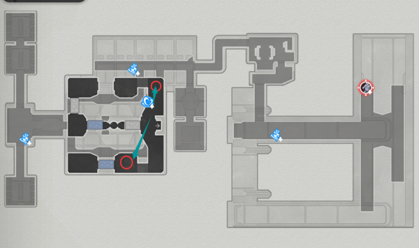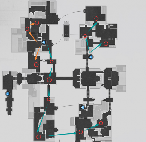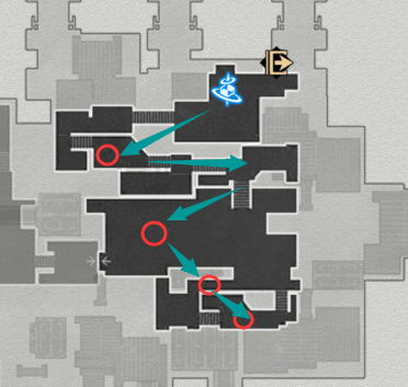最佳路线:从飞星小筑的转移点下楼梯,清剿4组敌人。