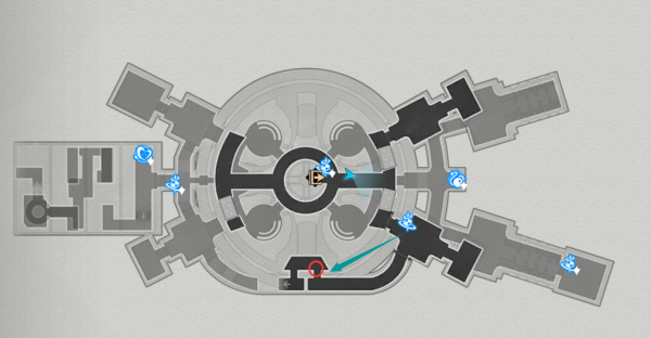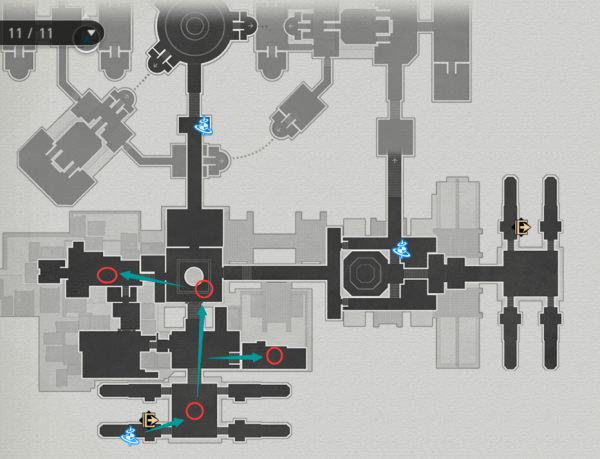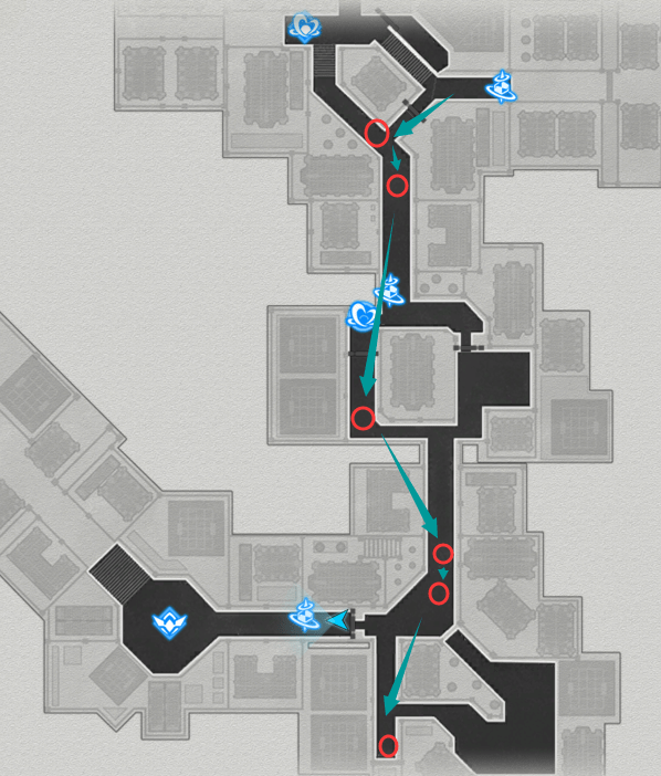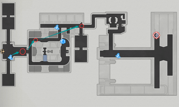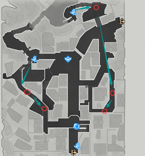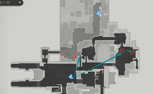 最佳路线:1。从传送点向右走俯视点,顺时针清除7组敌人。