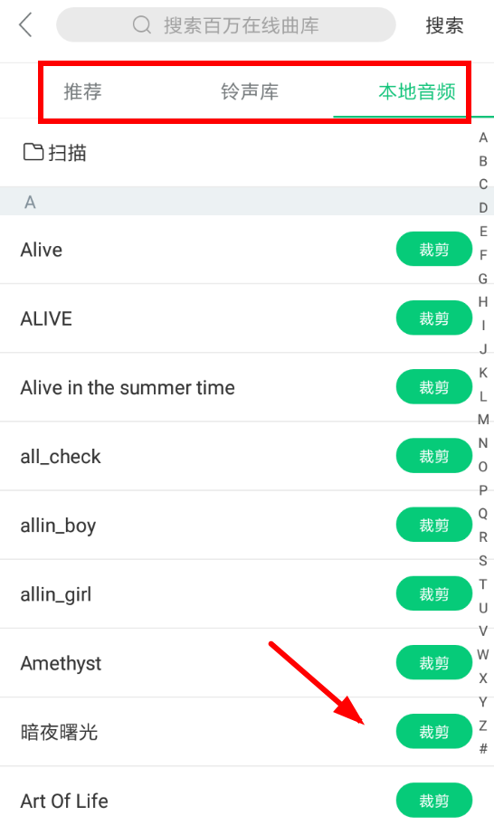 2.然后大家就会进入音频文件选择界面。我们不仅可以使用在线音乐库,还可以扫描手机本地音频进行编辑。
