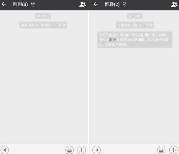 而如果有人删除你的好友,会显示“你不能邀请未加你为好友的用户进行群聊,请先向XXX发送好友验证申请,对方才能加入群聊”。这就是真相,一目了然。