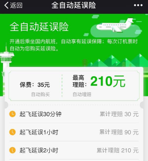 随着冬季冰雪的到来,航班延误将再次进入高峰期。微信推出的“全自动延误险”保费35元,最高理赔210元,具体为: