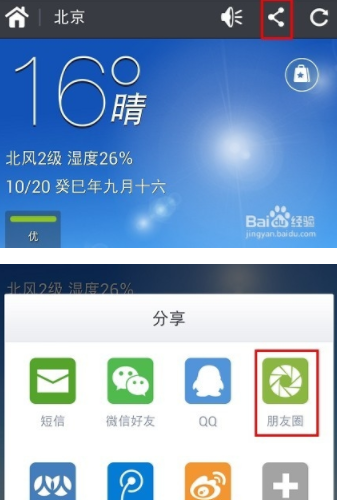 点击图中的“分享”按钮,将天气分享到微信朋友圈。在“微信”界面点击“朋友圈”进入界面。朋友会看到你发的天气信息,点击查看详情。