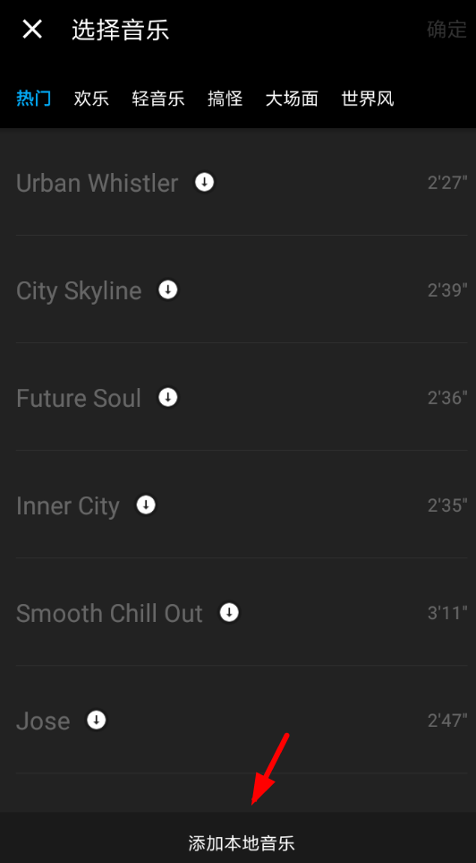 4.进入添加音乐列表后,通过底部的“添加本地音乐”功能,软件会扫描手机上的所有本地音频文件,方便您进行设置和添加。