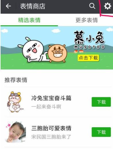 点击表情菜单,进入表情商店。微信表情会有很多不同的种类。点击页面右上角进入我的表情。