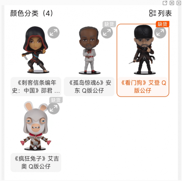 目前店里的库存还不到一半。看门狗、孤岛惊魂6、狂兔全部售罄,刺客信条的手作只有黑旗的黑胡子、奥德赛的亚历克西斯和中国纪事的邵云。