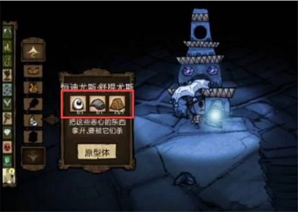 2.然后就可以在远古科技栏目看到眼睛炮塔的制作了。制作材料为犀牛角1个、鹿角眼球1个、铥矿5个;
