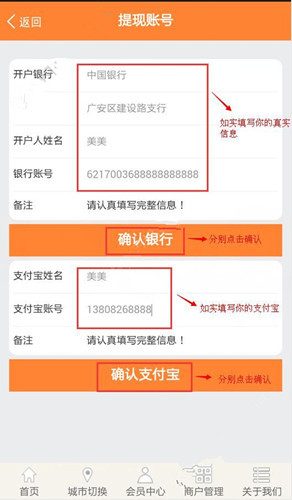 ? 4、填写提现账户信息,如下图所示;如果使用支付宝,银行网点无需填写;反之,则不能填写银行卡支付宝;也可以两者都填写,然后在提现时做出选择;