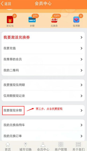 ? 5、账户信息填写完毕后,返回会员中心主界面,点击“我要提现余额”;