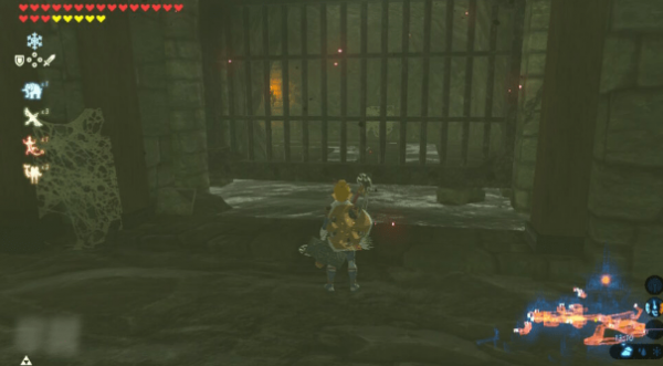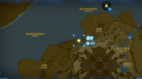 城堡左上方的水路接近城堡后,地图会切换到城堡模式,赫利亚之盾在城堡的地下监狱里,地下监狱的入口在下面当前的位置(黄色指示器)。